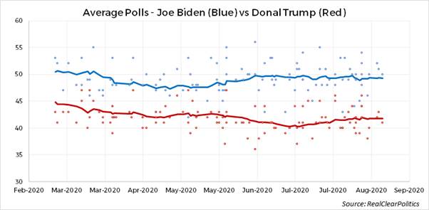 È indubbio che la recessione in corso, la crisi sanitaria e il movimento#blacklivesmatter abbiano comunque riaperto una partita che fino a pochi mesi fa sembrava definitivamente chiusa. Se confrontiamo i sondaggi attuali con quelli dello stesso periodo relativi alle elezioni 2016, il vantaggio del candidato democratico appare decisamente più ampio.