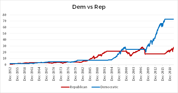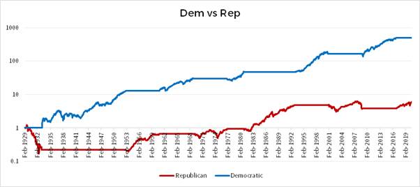 Dal momento che la Grande Depressione si è generata soprattutto dagli squilibri dei ruggenti anni Venti, che furono prevalentemente a presidenza democratica, bisogna ovviamente chiedersi se sia giusto imputare ai repubblicani quel -80%. Tuttavia, se anche partissimo da un periodo successivo, investendo un euro dal dicembre 1949, la sovra performance democratica troverebbe comunque una conferma.