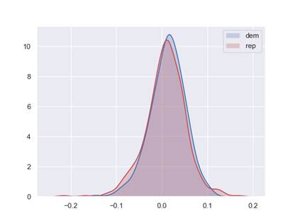 Tracciando su un grafico la distribuzione dei rendimenti durante le due presidenze, la media (grosso modo dove c’è un picco) non appare così diversa. Un test statistico lo conferma: il livello di significatività della differenza è basso. E, per stressare ulteriormente l’importanza del campione temporale, di come questo impatti in maniera significativa sul grafico iniziale, partendo dai dati storici abbiamo generato migliaia di campioni casuali e analizzato la differenza di rendimento tra quei periodi in cui la presidenza era in mano ai democratici e quelli in cui era in mano ai repubblicani. La tecnica rende giustizia ai repubblicani. La differenza tra le performance dei due schieramenti rimane significativa solo nell’8% dei campioni.