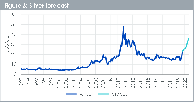 L’argento potrebbe aumentare sensibilmente, attestandosi su 36 dollari l’oncia (figura 3), registrando un rialzo superiore al 25% rispetto ai livelli attuali. Al 31 luglio 2020, l’aumento registrato sarebbe stato superiore al 50%, ma l’argento si è mosso molto rapidamente nell’arco di una settimana.