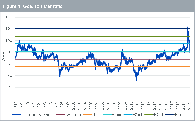 Dal 2019 il rapporto tra le quotazioni dell’oro e dell’argento è elevato e ha raggiunto l’apice (123) nel marzo 2020, con un valore prossimo a 4 deviazioni standard sopra la media dal 1990 (figura 4). Con il rally di recupero recentemente messo a segno dall’argento, il rapporto è sceso a 74. Secondo le previsioni nello scenario dello status quo, il rapporto tra le quotazioni dell’oro e dell’argento continuerà ad aggirarsi su questo range di valori, di poco superiore alla media a lungo termine (68) dal 1990. Non crediamo che il rapporto scenderà molto al di sotto di tale valore, considerando i possibili venti contrari che l’argento potrebbe affrontare in caso di peggioramento delle condizioni economiche (i timori in tal senso stanno mantenendo i rendimenti dei titoli di Stato a livelli bassi e le posizioni speculative sull’oro a livelli elevati).