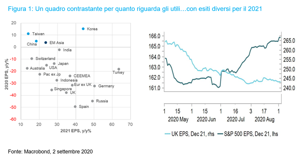 Per la verità, l’Asia emergente è l’unica regione in cui si prevede una crescita degli utili positiva nel 2020 e nel 2021 (Figura 1, asse sx) e, insieme agli Stati Uniti, è l’area in cui concentriamo il nostro rischio azionario. Il Regno Unito e in misura minore l’Europa (Regno Unito escluso) hanno registrato nette flessioni degli utili quest’anno e le previsioni per i profitti societari di fine 2021 sono state riviste al ribasso, in direzione opposta rispetto a quelle di Stati Uniti e Asia emergente (Figura 1, asse dx). A tutto ciò si aggiungono sfide come la Brexit, il picco della disoccupazione previsto per ottobre con il venir meno dei programmi di cassa integrazione e la composizione del mercato, che orienta l’indice verso i fattori value che saranno messi in discussione nel contesto da noi previsto, ma torneremo sull’argomento più avanti.