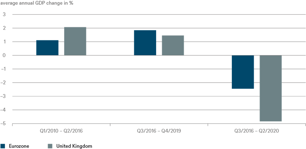 Al Regno Unito verranno probabilmente risparmiati gli scenari da brividi di una brusca interruzione del traffico transfrontaliero o di un’improvvisa mancanza di farmaci o di prodotti alimentari specifici. Ciononostante, Londra in particolare dovrebbe essere desiderosa di evitare ulteriori danni causati dall’uscita dall’Unione europea. Come illustrato nel grafico, l’esito del referendum sull’UE ha già inflitto considerevoli traumi economici. Sebbene negli anni precedenti al referendum sull’UE il Regno Unito abbia registrato tassi di crescita notevolmente più elevati (e, di conseguenza, una maggiore prosperità) rispetto al resto d’Europa, da allora è il fanalino di coda. Come osserva Katrin Loehken, economista per il Regno Unito di DWS, i risultati inferiori alle aspettative sono iniziati ben prima della crisi del Covid-19, che ha scatenato una recessione economica ben più grave in Gran Bretagna che nel continente.