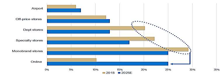 Tuttavia, il lusso non sta beneficiando solamente di una domanda interna più forte in Cina, ma anche del canale che per eccellenza sta guidando l’uscita della recessione: l’E-Commerce. Quest’ultimo, in particolare, potrà essere responsabile della ripartenza del mercato del lusso. Si osservi il grafico rappresentato: ci si attende che su base globale la quota delle vendite online dei beni personali di lusso (abbigliamento, accessori, gioielli, cosmetici, etc.) assumerà un ruolo sempre più preponderante nel 2025, andando via via a sostituire i negozi fisici (store). E l’E-Commerce, infatti, è uno dei Quality Trends profittevoli su cui puntiamo per il futuro, grazie anche al settore del lusso. Per quali motivazioni?