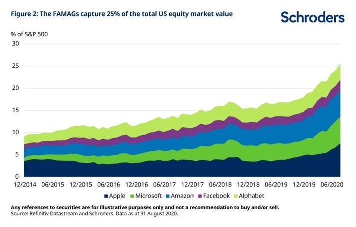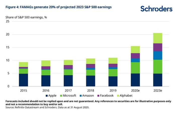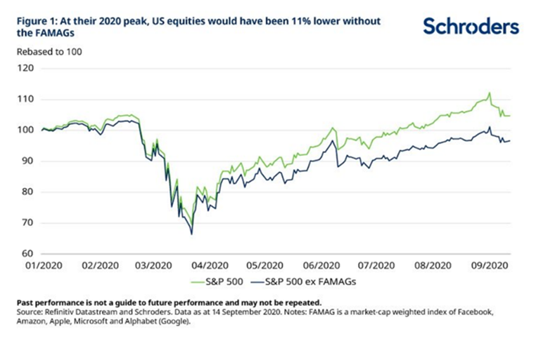 Al 14 settembre, l’S&P 500 era in rialzo del 6% quest’anno, mentre le FAMAG nel complesso registravano un +42%. Escludendo le Big Tech, i rendimenti dell’indice crollano a -2%. In altre parole, l’azionario Usa avrebbe avuto performance dell’8% più basse quest’anno senza le FAMAG (o dell’11% se misurato nel momento di picco del 2 settembre). Ciò dimostra quanto siano diventate importanti queste aziende.