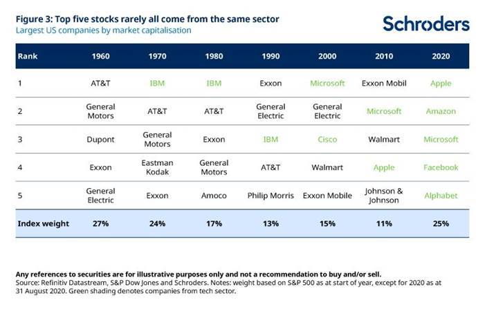 I cinque maggiori membri dell’S&P 500 sono oggi tutti esponenti del settore tech. L’ultima volta che il mercato azionario Usa è stato così concentrato è stato alla fine degli anni ’60. Non è inusuale che il mercato sia concentrato; a essere strano è il fatto che le cinque principali aziende siano parte dello stesso settore, quello tech. Questa mancanza di diversificazione non dovrebbe essere presa alla leggera. Qualsiasi cambiamento nel sentiment sul tech può avere un impatto spropositato sul mercato, come già successo.