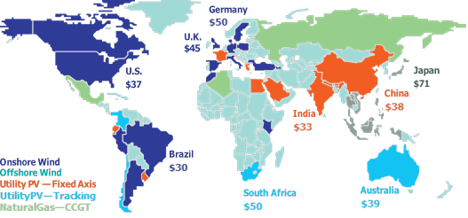 Il grafico mostra il costo standardizzato di riferimento dell’elettricità (LCOE) per ogni paese in dollari per megawattora.