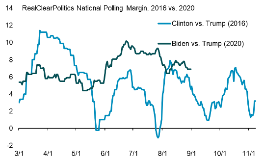 Gli investitori tuttavia non dovrebbero pensare che la reazione del mercato quest’anno sia altrettanto drammatica, per due ragioni fondamentali. Primo, il risultato potrebbe essere scontato dai mercati prima delle elezioni. Infatti, una lezione appresa nell’ultima elezione è che la valutazione dell’andamento della competizione basata sul voto popolare nazionale è tutt’altro che infallibile. Anche se nel 2016 i sondaggi nazionali finali erano in realtà abbastanza vicini ai risultati del voto popolare (meno si parla della qualità dei sondaggi statali nel Midwest, meglio è). La figura 1 che segue mostra tuttavia come la corsa presidenziale del 2020 sia diversa da quella del 2016, fino ad ora. Il vantaggio di Joe Biden sul Presidente Trump è stato più stabile e, in media, più elevato di quello di Hillary Clinton quattro anni fa.