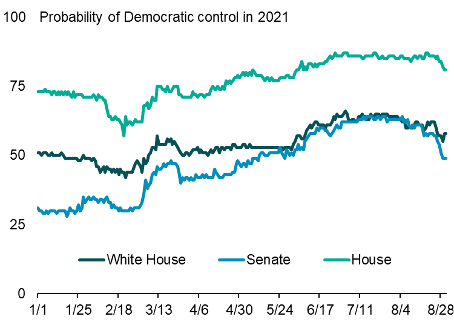 Secondo, per quanto riguarda la tassazione, è probabile che poche o nessuna delle principali riforme siano attuate fino a ben oltre il 2021. Indipendentemente da come sarà organizzata Washington il prossimo anno, affrontare la pandemia e la conseguente difficoltà economica sarà sicuramente il primo compito. Se l’ex vicepresidente Biden dovesse vincere con una maggioranza democratica sia alla Camera che al Senato (attualmente intorno al 50% di probabilità secondo PredictIt, – Figura 2), l’agenda legislativa dipenderà dal margine al Senato e dallo stato dell’economia alla vigilia dell’anno prossimo. Se gli Stati Uniti dovessero essere ancora alle prese con la chiusura di aziende e scuole a causa del coronavirus, i cambiamenti radicali all’assistenza sanitaria e alle politiche ambientali passerebbero in secondo piano rispetto agli stimoli e al supporto all’emergenza.