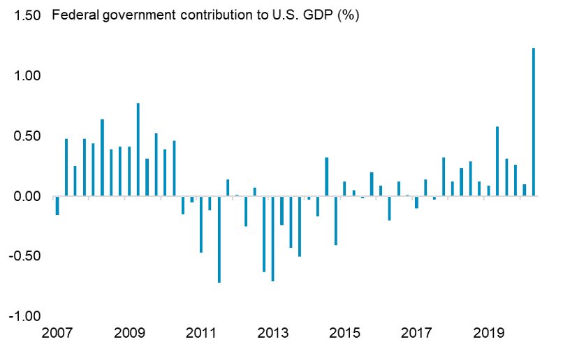Se l’ex vicepresidente Biden diventasse Presidente e il Senato passasse sotto il controllo democratico, è prevedibile almeno un moderato aumento delle imposte sul reddito delle imprese e di alcuni individui e un aumento ulteriore della spesa federale per finanziare più stimoli fiscali, assistenza sanitaria e riforme della politica ambientale. Tuttavia, una vittoria di Biden con i repubblicani al Senato aumenterebbe il rischio di un processo legislativo e di allocazione di bilancio in stallo. Nel recente passato questa condizione ha portato di fatto all’austerità e ad un contributo negativo al PIL da parte della spesa e degli investimenti governativi (Figura 3).