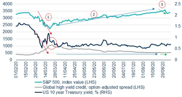 Il punto oggi è se la nuova normalità post pandemica modificherà il più vecchio escamotage dei manuali per gli investitori, vale a dire quello di coprire il rischio con i titoli di Stato. Se da lato tale sistema ha funzionato relativamente bene nel corso del primo trimestre di quest’anno, dall’altro c’è da notare come da allora in poi i tassi si siano mossi all’interno di un intervallo stretto, dato il rally sia del mercato azionario sia del credito.