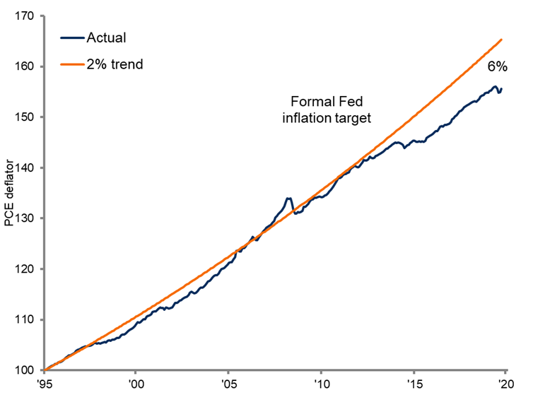 Negli Stati Uniti l’inflazione è stata in media vicina al 2% negli ultimi vent’anni, prima che la Fed adottasse formalmente un target di inflazione. Da allora abbiamo osservato un gap di oltre il 6% rispetto al trend del 2%. È vero che le medie sono determinate da quanto tempo si è scelto di guardare indietro, ma anche guardando indietro di pochi anni, è evidente che il gap è superiore al 2%. La conseguenza di ciò è che l’inflazione sarà lasciata correre ben al di sopra del 2%, se mai ci arriverà, e per lungo lasso di tempo. Si potrebbe anche sostenere che, dati i livelli di inflazione sottotono del passato, la Fed ha de facto appena abbandonato il suo obiettivo di inflazione.