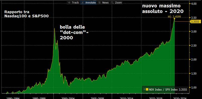 A questo punto il parallelismo con i primi anni 2000 sembra particolarmente interessante, alla luce della forte sovraperformance dei titoli ad alta crescita che ha raggiunto proporzioni estreme. Come si può vedere dal grafico in basso, a settembre il differenziale di performance tra l’indice Nasdaq 100 (rappresentativo della cosiddetta “new economy”) e lo S&P 500 (che invece è utilizzato come indice di riferimento del mercato generale) ha raggiunto nuovi massimi storici (3.35), superando i livelli del 2000, durante quella che fu poi definita come “la bolla delle dot-com”.