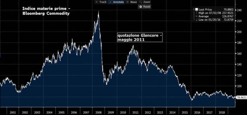 Un’altra IPO particolarmente significativa è stata Glencore, società leader mondiale nel trading delle materie prime, quotata nel maggio 2011 con una valorizzazione di circa 60 miliardi di dollari. In questo caso gli investitori che avessero tenuto le azioni fino ad oggi avrebbero registrato una perdita di oltre il 50%, un risultato certamente deludente che coincide con un sostanziale declino strutturale del valore delle materie prime, come evidenziato nel seguente grafico.