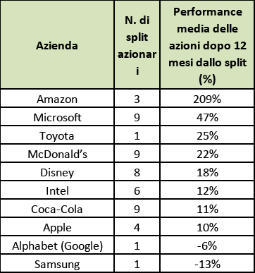 Come parte della sua analisi, eToro ha analizzato i movimenti di prezzo delle azioni delle 10 aziende più grandi al mondo che hanno effettuato uno “share split”. Si tratta di Apple, Alphabet (Google), Microsoft, Amazon, Coca-Cola, Disney, Samsung, McDonald’s, Toyota and Intel.