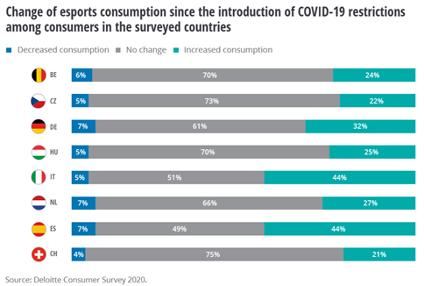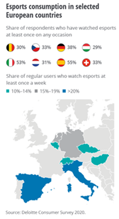 Lo studio Deloitte condotto a giugno 2020 su 12.000 consumatori, ha voluto raccogliere dati e informazioni primarie sugli sviluppi del mercato europeo degli eSport. Hanno preso parte al sondaggio 1.500 rispondenti per ciascuno degli otto paesi europei coinvolti: Italia, Belgio, Germania, Ungheria, Spagna, Svizzera, Repubblica Ceca e Paesi Bassi. Sono stati approfonditi il livello di conoscenza e utilizzo degli eSport, sia dal punto di vista dei giocatori, sia da quello dei fruitori passivi di contenuti, come ad esempio eventi e match in streaming (la ricerca ha anche indagato canali di fruizione, titoli e intenzione d’acquisto, con uno spaccato pre e post Covid).