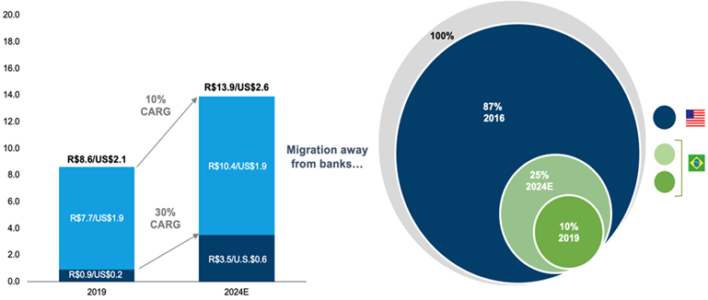Prevediamo che l’intermediazione online sarà sostenuta anche da afflussi significativi nel mercato azionario brasiliano, in quanto i risparmiatori ricercano rendimenti più appetibili dopo il calo dei tassi d’interesse. Si stima che i nuovi investimenti possano avvicinarsi ai 91 miliardi di real (17 miliardi di dollari) nei prossimi cinque anni e, secondo le stime più prudenti, entro il 2025 l’allocazione azionaria dovrebbe raggiungere il 25% delle masse in gestione, a fronte dell’attuale 10% circa. Questa opportunità dovrebbe consentire ai broker online di crescere con un ritmo più rapido rispetto al settore e modificare la natura estremamente concentrata della gestione patrimoniale brasiliana, in particolare per le società basate sull’imprenditorialità nel cui DNA sono insite la tecnologia e l’innovazione, permettendo loro di trarre i maggiori vantaggi da questa trasformazione dirompente.