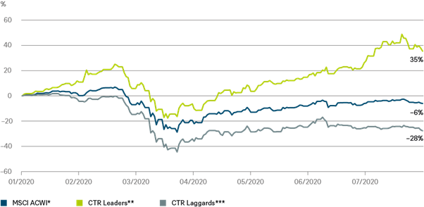 Attraverso il nostro rating proprietario CTR, abbiamo esaminato le società per le quali i cambiamenti climatici rappresentano un’opportunità (leader CTR) comparandole a quelle per le quali essi costituiscono un rischio (ritardatari CTR). Come illustrato nel Grafico della Settimana, quest’anno si è registrata una notevole divergenza tra le performance dei leader e quelle dei ritardatari della transizione climatica. Mentre i primi hanno avuto risultati migliori al MSCI AC World Index del 41% nell’anno in corso (al 31/07/2020), le performance dei secondi hanno subito un calo del 22%.