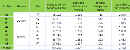 - la stima dei valori delle pensioni medie nette oscilla tra i 1.227€ delle donne quarantenni e i 1.560€ degli uomini sessantenni, con una media complessiva per gli 8 profili di 1.337€ netti al mese