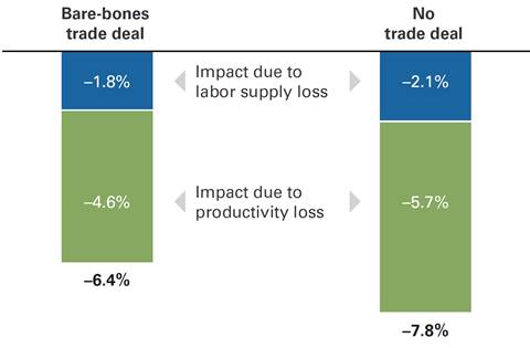 Notes: This figure shows the cumulative impact of Brexit on GDP by 2030. Productivity impact is estimated using a vector error correction model that incorporates a proxy for trade openness and foreign direct investment. Human capital growth is assumed to be unaffected by Brexit. Labor supply is assumed to grow at a similar rate to total population growth.