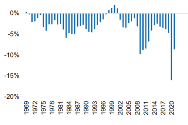 Storicamente, l’andamento dell’azionario americano è stato migliore sotto un governo “split”, o “spaccato” fra Camera dei Rappresentanti e Senato (+12%) che non sotto un governo “sweep” o “monocolore” (+9%). Secondo Neuman in un governo spaccato vi è meno incertezza ed è meno probabile che vengano approvate nuove leggi. Gli investitori sono preparati e hanno la sensazione di conoscere le regole del gioco poiché è improbabile che vengano approvate provvedimenti con un forte impatto sui mercati. Tuttavia, secondo i bookmakers le chance di uno sweep democratico (in cui entrambi i rami del Congresso siano controllati da un solo partito) sono concrete . Ciò significa che leggi dall’impatto significativo, ad esempio sulle tasse oppure su un aumento di spesa, saranno più probabili. Al momento vi è un consenso crescente in entrambi i partiti che uno stimolo fiscale, raggiunto attraverso un taglio delle tasse o un aumento di spesa e che si tradurrebbe in un aumento del deficit, sia accettabile e persino auspicabile. Secondo l’analisi di Neuman ci sono buone chance che esso possa beneficiare il mercato azionario nel suo insieme oltre le attese di molti. Come si può vedere dal grafico 1 sembra proprio che, soprattutto nel 2020, il bilancio federale non sia più una preoccupazione (ad es. i tassi d’interesse e l’inflazione rimarranno bassi). Un aumento del deficit è stato associato a migliori rendimenti sui mercati azionari – più spesa e tasse più basse hanno aumentato gli utili aziendali.. Le proposte del gruppo di Biden vanno nella stessa direzione – la spesa sarebbe molto superiore alle entrate.
