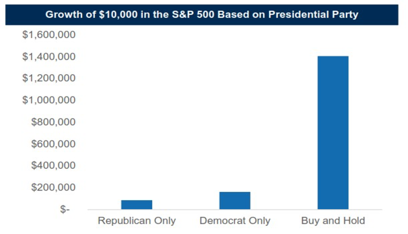 Quando Donald Trump fu eletto presidente nel 2016, annunciò la propria strategia “America First” e approvò leggi per ridurre le tasse al fine di sostenere le aziende nazionali. Se si osservano più da vicino le azioni dello S&P 500 con un’alta esposizione nazionale, è facile vedere come nell’ottobre 2017, quando fu approvato il taglio fiscale, la performance delle aziende nazionali, che avrebbero dovuto beneficiarne più di tutti, non migliorò. Così, un portafoglio con un focus sugli USA ottenne rendimenti significativamente inferiori di un portafoglio, ad esempio, orientato all’innovazione. Questo significa che innovazione e fondamentali sono molto più importanti della politica. Neuman conclude che gli investitori non dovrebbero essere influenzati dai risultati elettorali e dai trend di breve termine. Come mostra il grafico 2, una strategia buy and hold che non badi al partito di chi è in carica ha chiaramente sovraperformato un portafoglio orientato al partito politico al potere. Utilizzare una strategia d’investimento orientata politicamente è stato fallimentare negli ultimi quattro anni e lo specialista di investimenti non crede che si dimostrerà un buon approccio nemmeno in questo ciclo.
