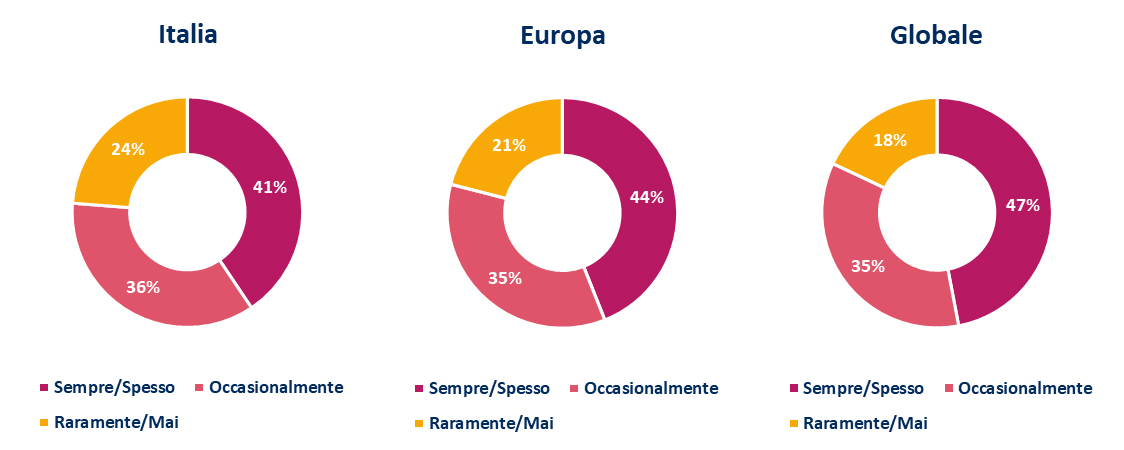 Lo studio, tuttavia, evidenzia al contempo l’esistenza di un gap da colmare, con le percentuali italiane che risultano inferiori sia a quelle europee che a quelle globali. In Europa infatti gli investitori scelgono gli investimenti sostenibili sempre/spesso nel 44% dei casi, occasionalmente nel 35% dei casi e raramente/mai nel 21% dei casi, mentre a livello globale le medie sono rispettivamente del 47%, 35% e 18%.