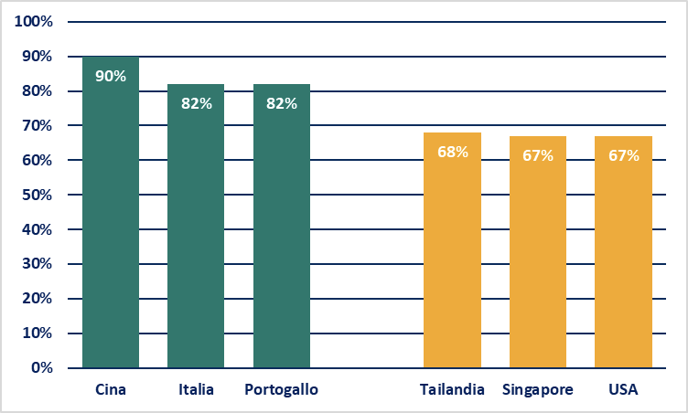 Figura 2: Paesi più e meno virtuosi, in base alla percentuale di investitori non disposti a investire in contrasto con i propri valori nemmeno a fronte di rendimenti maggiori