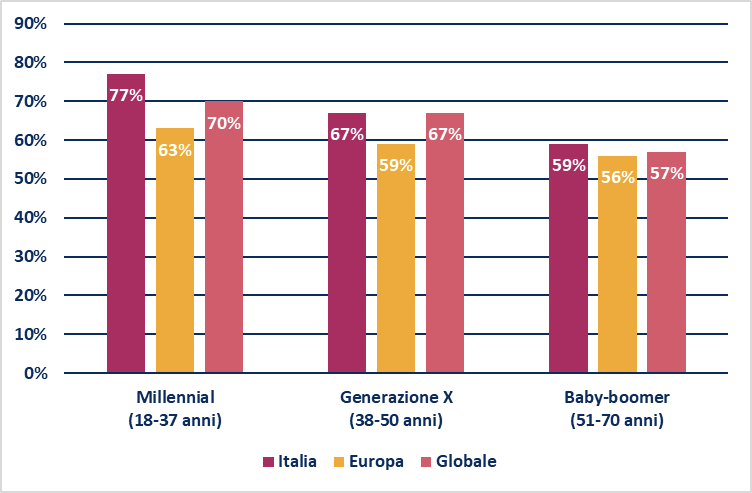 E se è opinione diffusa che le generazioni più giovani abbiano più a cuore il tema della sostenibilità, lo spaccato generazionale dei dati evidenzia come siano proprio i Millennial la fascia d’età più interessata a comprendere meglio questo tipo di investimenti. In Italia ben il 77% dei Millennial afferma di aver chiesto informazioni al proprio consulente finanziario, contro il 67% della Generazione X e il 59% dei Baby-boomer. La tendenza è simile, ma con un livello di interesse minore, sia a livello globale (70% dei Millennial, 67% della Generazione X e 57% dei Baby-boomer), che a livello europeo (63% dei Millennial, 59% della Generazione X e 56% dei Baby-boomer).