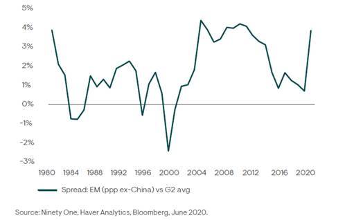 Non è ancora chiaro quale sarà l’effetto del Covid-19 nel breve e nel medio termine per i mercati emergenti, ma sappiamo già che l’impatto della pandemia non ha precedenti nella storia economica moderna. Tuttavia, data la condizione demografica più vantaggiosa (popolazione più giovane e quindi meno a rischio) e considerato che le misure di lockdown messe in atto non sono state così dure come altrove, è probabile che il colpo che subiranno i mercati emergenti sarà moderato. Infatti, le previsioni del Fondo Monetario Internazionale (FMI) rivelano che il differenziale di crescita tra emergenti e sviluppati aumenterà quest’anno, raggiungendo il suo divario più ampio dalla crisi finanziaria del 2008.