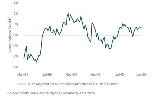 Oltre al Covid-19, attualmente la minaccia più grave per i mercati emergenti è una nuova escalation della guerra commerciale tra USA e Cina e una generale espansione delle politiche protezionistiche. Tuttavia, registriamo un basso rischio di una crisi della bilancia dei pagamenti nei mercati emergenti, i cui conti sono molto solidi, per non parlare del fatto che hanno riserve più che sufficienti per scongiurare crisi di questo tipo, qualora i rapporti commerciali internazionali si deteriorassero: in media, i mercati emergenti vantano riserve pari a circa il 140% della “Reserve Adequacy Measure” del Fondo Monetario Internazionale.