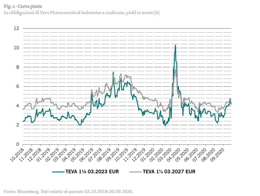 Con l’impegno sia delle banche centrali che dei governi a fornire supporto finanziario destinato a durare mesi e non decenni, il credito a più breve scadenza è particolarmente interessante. La curva dei titoli high yield è praticamente piatta. Ad esempio, l’obbligazione con scadenza 2027 di Teva Pharmaceutical Industries è attualmente scambiata a soli 42 pb di rendimento in più rispetto all’omologa del 2023 (si veda la Fig. 2). Investendo in scadenze più brevi, gli investitori ottengono in questo modo rendimenti simili, assumendosi un rischio di duration inferiore.