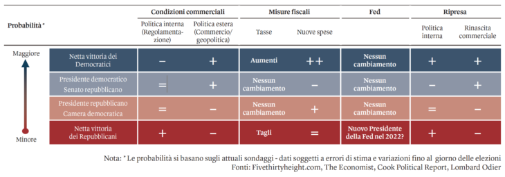 In termini di possibili risultati generali delle elezioni – che probabilmente verranno definiti solo a seguito di lunghe dispute, con una scadenza ultima al 6 gennaio 2021 – possiamo immaginare quattro scenari, che vanno dalla netta vittoria dei Repubblicani (meno probabile) alla netta vittoria dei Democratici (più probabile). Per netta vittoria, intendiamo la vittoria sia alla Casa Bianca che alle due camere del Congresso. Nella Tabella sono sintetizzate le implicazioni macroeconomiche di ciascuno scenario per quanto riguarda le condizioni commerciali, le politiche fiscali, la leadership della FED e la velocità della ripresa.