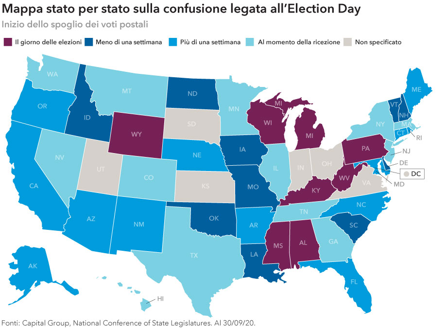A meno che non si tratti di una vittoria schiacciante per il Presidente Trump o per l’ex Vice Presidente Joe Biden, “il risultato delle elezioni presidenziali probabilmente non sarà noto per giorni o addirittura settimane”, afferma Emerson, “poiché gli stati saranno occupati a gestire un volume di voti postali senza precedenti”. “È probabile che questo periodo di incertezza sia accompagnato da alti livelli di volatilità di mercato”, aggiunge.