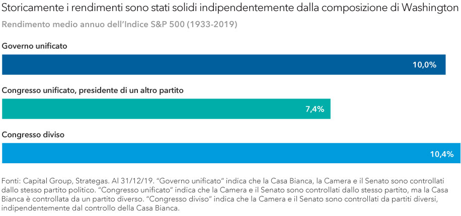 Per gli investitori a lungo termine, è importante ricordare che, storicamente parlando, la struttura del potere politico di Washington, D.C., non ha avuto un impatto molto evidente sui rendimenti del mercato azionario. Dal 1933 al 2019, sotto governi unificati e divisi, il rendimento medio annuo per l’indice Standard&Poor’s 500 Composite è rientrato in un ampio intervallo compreso tra il 7% circa e il 10%. Un Congresso diviso, come quello che abbiamo oggi, sembra essere la scelta preferita del mercato, con un rendimento del 10,4%.