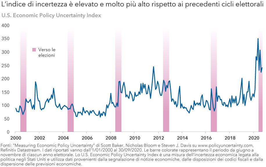 In prospettiva, lo U.S. Economic Policy Uncertainty Index, che tiene traccia di una serie di misure di incertezza economiche, politiche e mediatiche, ha raggiunto livelli senza precedenti nel 2020. Gli investitori forse si staranno chiedendo: che cosa potrebbe succedere dopo?