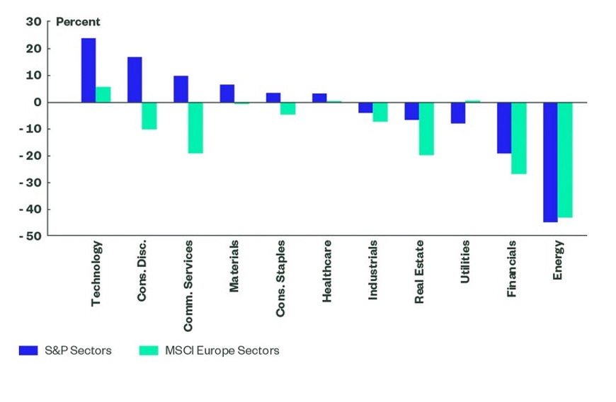 È interessante notare che abbiamo assistito a una forte dispersione della performance tra gli stessi settori in Europa e negli USA (grafico riportato di seguito). In qualità di fornitori di ETF UCITS che replicano i settori di entrambe le regioni, siamo molto interessati a queste differenze e cerchiamo di individuare le migliori opportunità in ogni mercato. In generale, i rendimenti sono stati più elevati nei settori statunitensi rispetto alle loro controparti europee – in linea con le attese, visti i movimenti dei relativi mercati azionari.