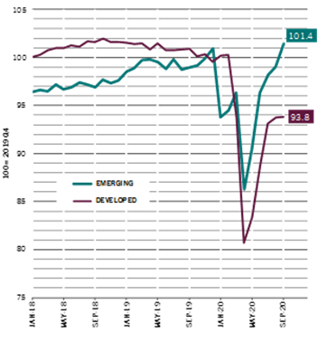 Paesi emergenti & sviluppati: Produzione Ind. (100=Q4 19)