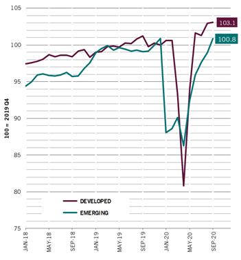 Paesi emergenti & sviluppati: Vendite al dettaglio (100=Q4 19)