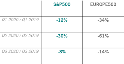 Andamento degli utili trimestrali anno fiscale 2020 rispetto a stesso period anno precedente, S&P500, Eurostoxx50