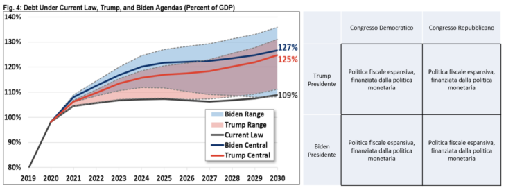 Nel grafico sottostante possiamo notare che il debito sul GPD si stima raggiunga un valore pari al 130% entro il 2030 con entrambi i candidati e che, indipendentemente dal presidente o dalla costituzione del congresso, il vero tema comune dominante sarà il medesimo: una politica fiscale espansiva finanziata dalla politica monetaria. Questi stimoli avranno effetto positivo su tutto il mercato equity ed in particolare sui titoli ciclici.