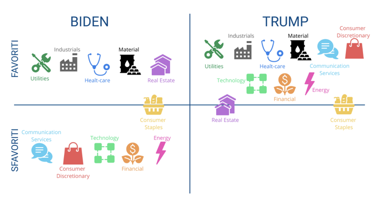 Proprio grazie all’effetto moltiplicativo sul GDP caratteristico degli investimenti infrastrutturali, entrambi i candidati propongono piani importanti di spesa, che nel caso di Biden saranno più focalizzati sul mondo della decarbonizzazione e della Green economy, con il neo eletto presidente che ha già dichiarato che gli USA rientreranno entro pochi giorni dal suo mandato nell’accordo di Parigi sul clima. I settori che trarranno maggior beneficio da queste tematiche sono: industriali, material, utility, rinnovabili e green energy.