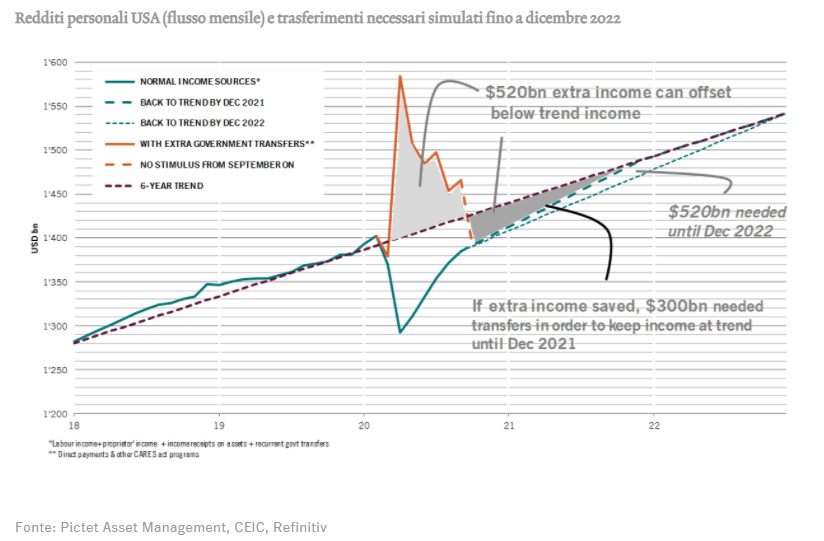 Per quanto il mercato del lavoro statunitense sia storicamente estremamente flessibile, come dimostra la parziale discesa della disoccupazione già a partire dei mesi estivi, potrebbero essere tuttavia necessari 1 o 2 anni per riassorbire il calo nel reddito da lavoro provocato dalla crisi attuale, soprattutto qualora dovessimo attendere ancora qualche mese prima di avere un vaccino efficace contro il COVID-19: le previsioni attribuiscono una probabilità del 72% al fatto che un vaccino approvato dalla FDA sarà distribuibile negli USA entro maggio del 2021. Nel frattempo, con Biden Presidente, aumentano le possibilità di una gestione della pandemia a livello federale, non più di singolo Stato, che potrebbe comportare misure di contenimento del virus più drastiche, sulla falsa riga di quanto fatto in Europa, con tutte le implicazioni socio-economiche che ne conseguono.