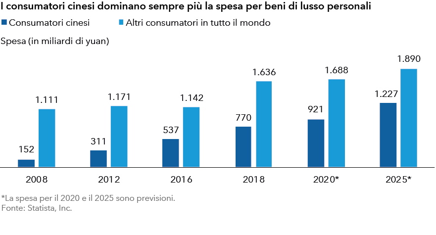 Data la natura discrezionale delle spese per i consumi, le vendite di beni di lusso sono considerate cicliche. L’evoluzione di una classe ricca in Cina e in altre economie asiatiche negli ultimi trent’anni ha fornito al settore una base per una crescita sostenuta e strutturale. Oltre a dominare il mercato, i clienti cinesi sono diventati sempre più esperti di prodotti di lusso in un tempo relativamente breve, attraverso acquisti frequenti e il consumo di social media.