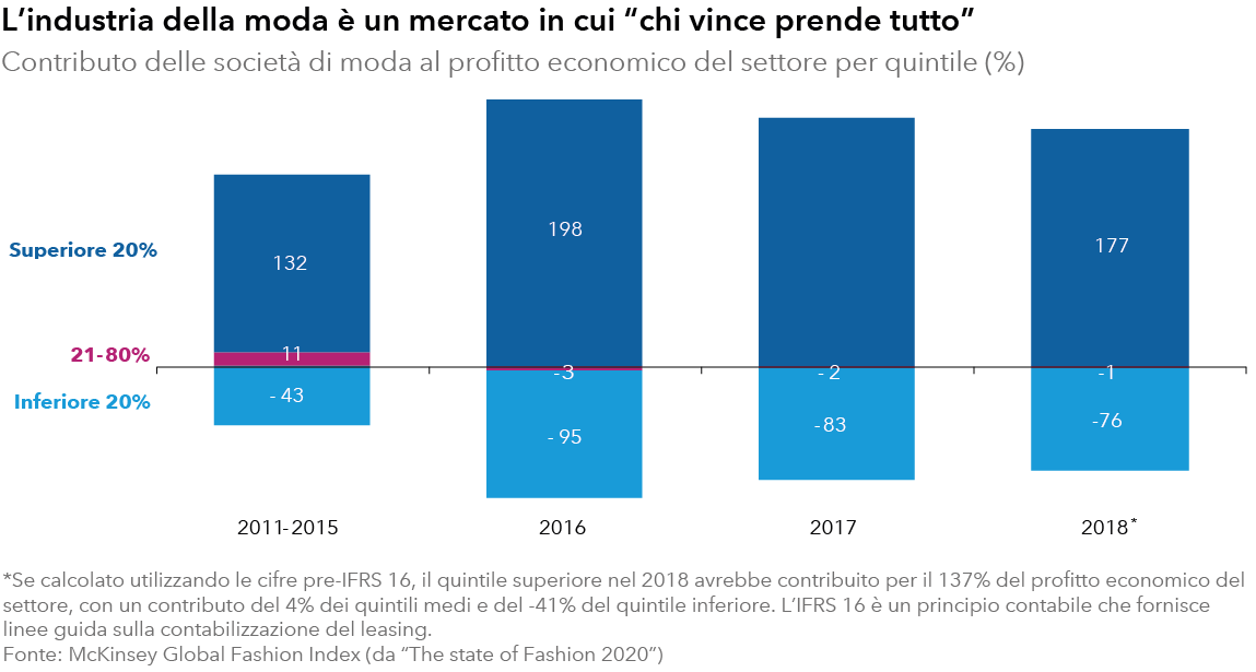 La creatività, la differenziazione e l’innovazione possono trainare la fedeltà al marchio, che a sua volta ha contribuito a trasformare i beni di lusso in un settore in cui “chi vince prende tutto”. Ad esempio, nel 2018 il 20% dei brand di moda più importanti rappresentava il 177% della redditività del settore.