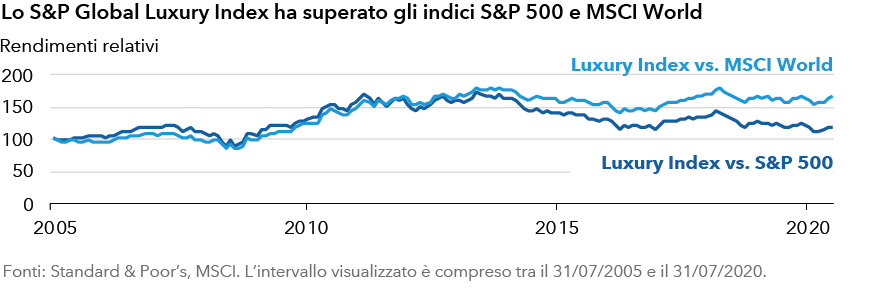 Il mercato dei beni di lusso personali è cresciuto a un tasso di oltre 1,3 volte superiore rispetto a quello del PIL globale dal 1996,1 e, fino ad oggi, i titoli dei beni di lusso hanno realizzato rendimenti interessanti a lungo termine con pochi periodi di difficoltà. Dal 2005, l’S&P Global Luxury Index ha realizzato un rendimento totale più elevato rispetto agli indici MSCI World e S&P 500.