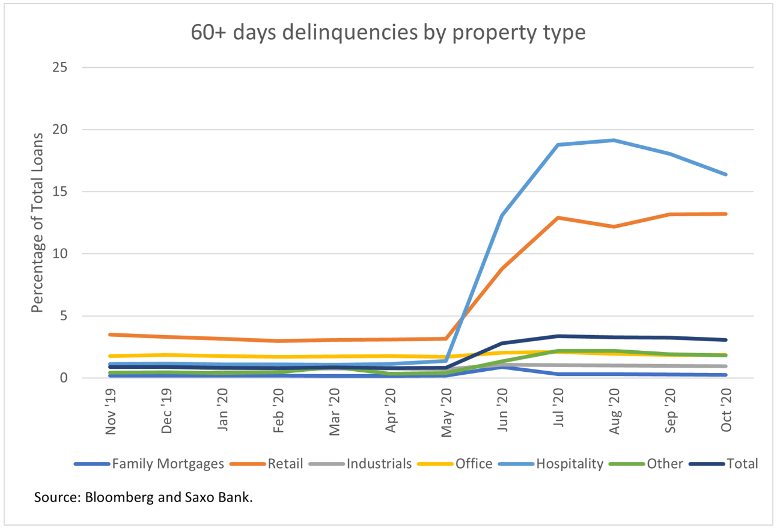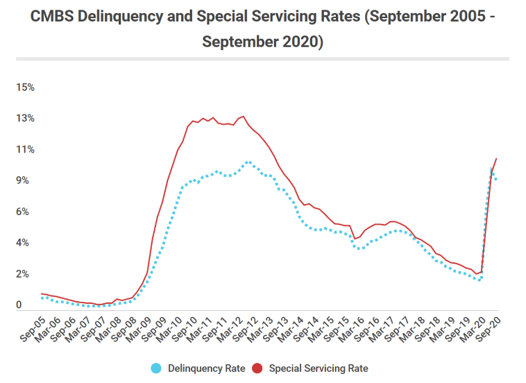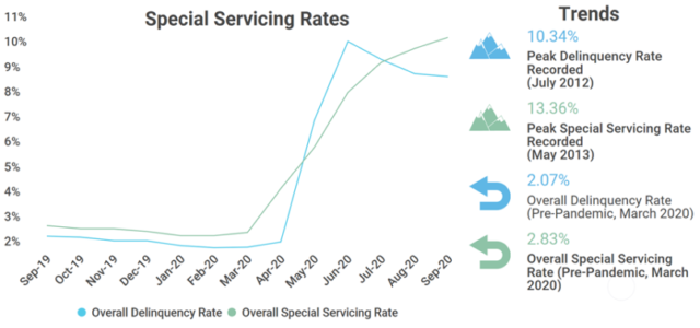 Anche se sembrerebbe che i tassi di insolvenza stiano diminuendo dal precedente picco di luglio, nella realtà dei fatti, sono state concesse alcune eccezioni su molti prestiti, il cui giudizio non è stato quindi aggiornato ad “insolvente” nonostante questi continueranno ad essere gestiti dalle società di Special Servicing. È necessario aspettare qualche mese per poter capire meglio se tali attività commerciali siano effettivamente in grado di ripagare i propri debiti. Pertanto, i dati che possono essere osservati nel seguente grafico potrebbero essere, nella realtà, peggiori di quanto mostrato, a causa dell’ “occultamento” di elementi di insolvenza.