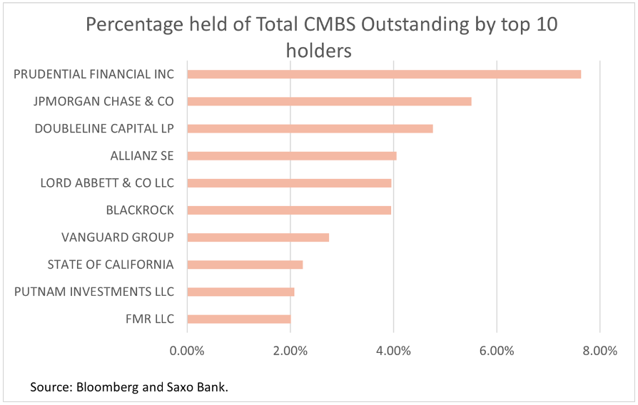 Purtroppo, non siamo stati in grado di identificare i possessori dei CMBS che sono stati impattati direttamente dagli effetti della pandemia, ma abbiamo identificato le società americane che detengono la maggiore quota di CMBS in generale. In questo modo, è possibile avere una panoramica di quelle che potrebbero essere le società che potrebbero essere maggiormente colpite da un incremento delle insolvenze sui mutui relativi agli immobili commerciali.