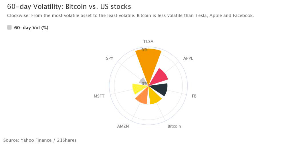 La scorsa settimana, il Bitcoin ha superato la soglia dei 15mila dollari per la prima volta da gennaio 2018. Cosa più importante, nonostante storicamente sia categorizzato tra gli asset altamente volatili, negli ultimi 60 giorni ha mantenuto livelli di volatilità più bassi di titoli blue-chip come Tesla, Apple e Facebook.