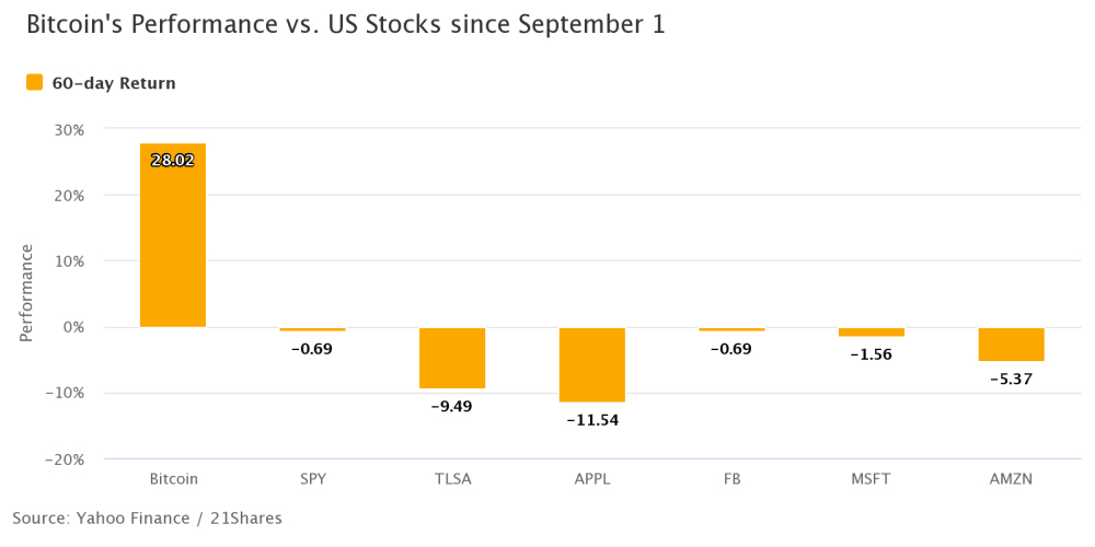 Come detto, nello stesso periodo in cui il prezzo del Bitcoin ha avuto un’impennata di oltre il 28%, titoli come Telsa (-9.49%), Apple (-11.54%), Facebook (-0.69%), Amazon (-5.37%), Microsoft (-1.56%) hanno performato in maniera deludente, come anche lo S&P500 nel suo complesso (-0.69%).
